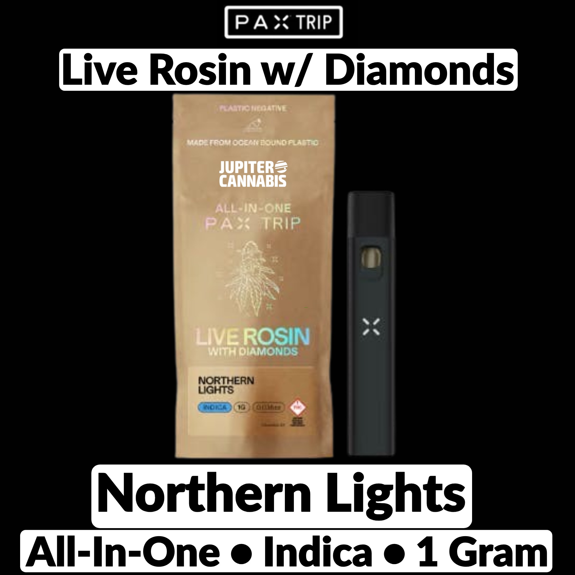 Pax Northern Light Aio Aio Diamonds is an indica all-in-one disposable vape pen. This 1.0g device requires no charging or setup — just inhale to enjoy 825mg THC with relaxing and calming effects. Perfect for on-the-go convenience. Available at Jupiter Cannabis in Winnipeg, Manitoba.