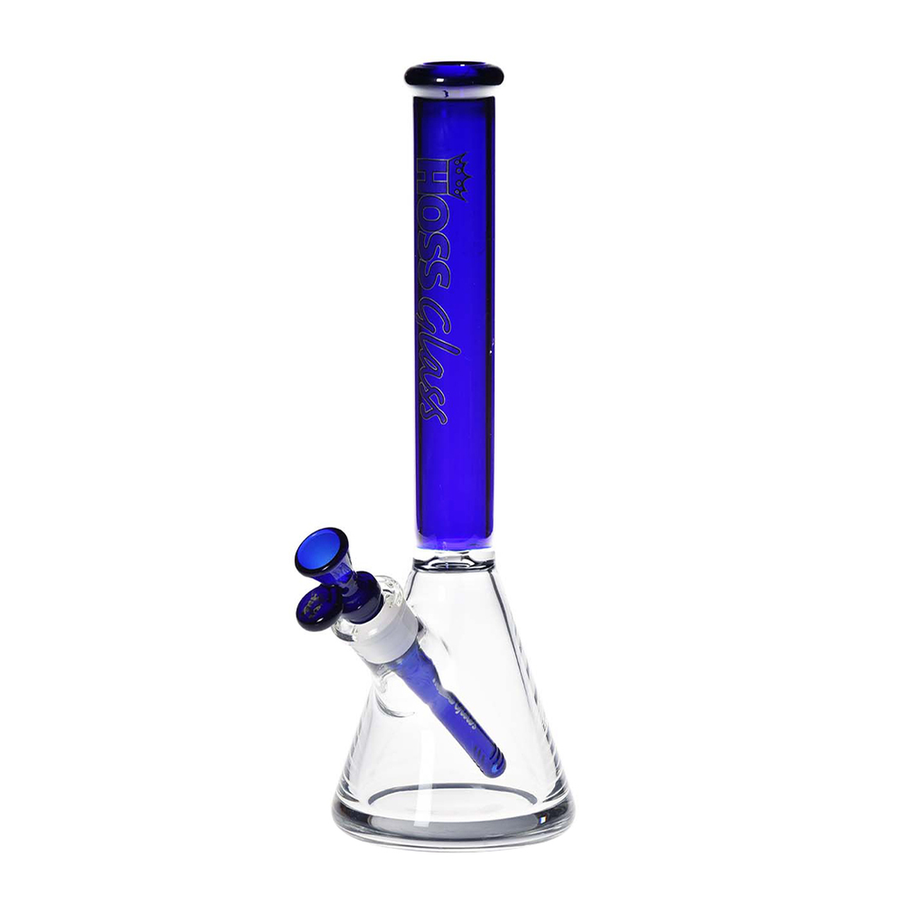 This glass beaker stands 14″ tall, and has been reinforced with a thick, all-around 10mm glass base, featuring a seamless, modern ice pinch, and a coloured top tube, downstem and cone bowl. The huge 20mm thick base of this water pipe is what sets is apart from the rest, making it Hoss Glass’ sturdiest water pipe available. This purchase has everything you need to start rippin’, as it not only includes your standard cone bowl, but also includes a Super Thick bowl, a quartz banger for concentrates, and a Hoss Glass carry case.