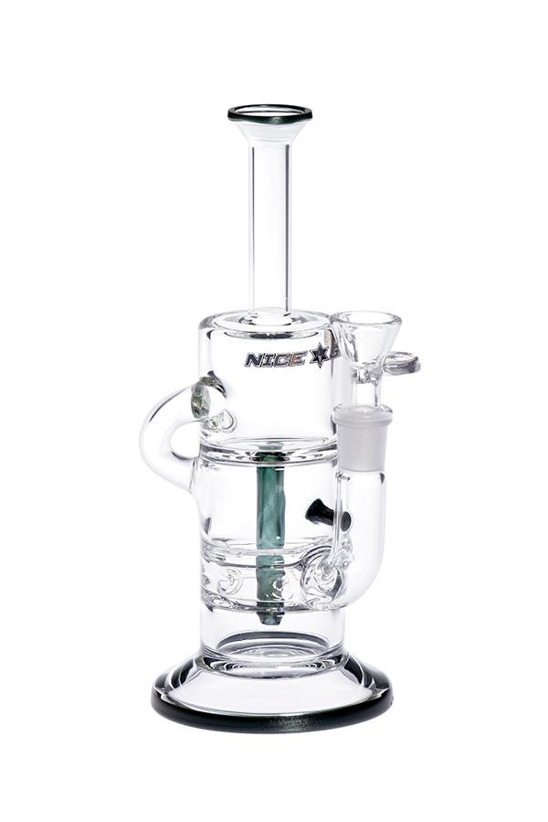 This Nice Glass recycler features a multi-hole ring percolator and a single recycler stem. The centre tube draws the smoke straight up to the upper body chamber before exiting the narrow neck to the flared mouthpiece.