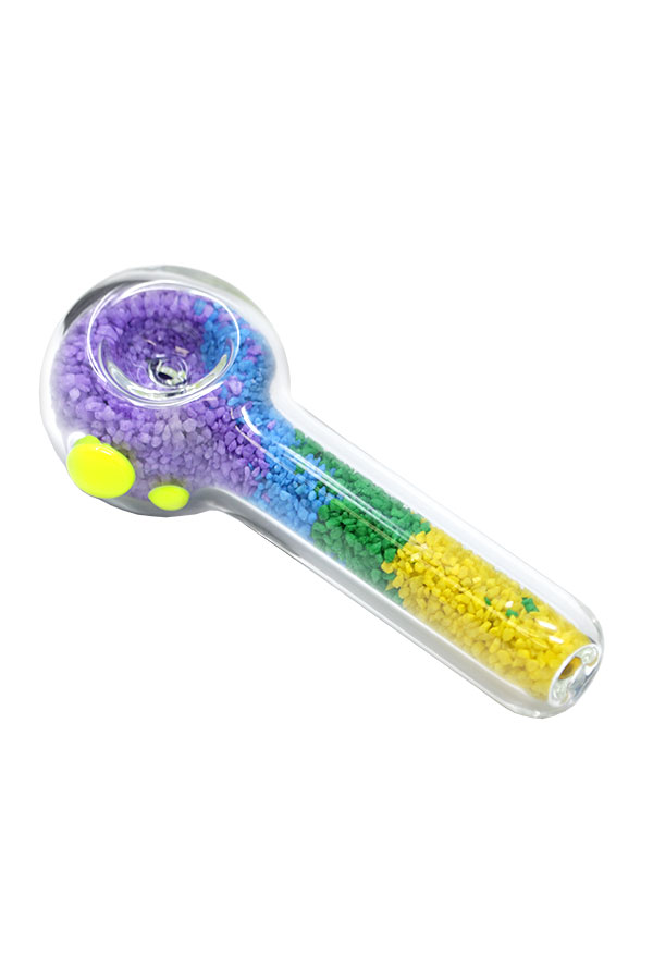 The all-clear hand pipe is filled with colourful sand, giving it more weight in your hands. The carb hole is located directly opposite of the mouth opening. The bowl is shallower than most, but also wider to counter-balance it. Roll stoppers on the side prevent any unwanted mishaps.