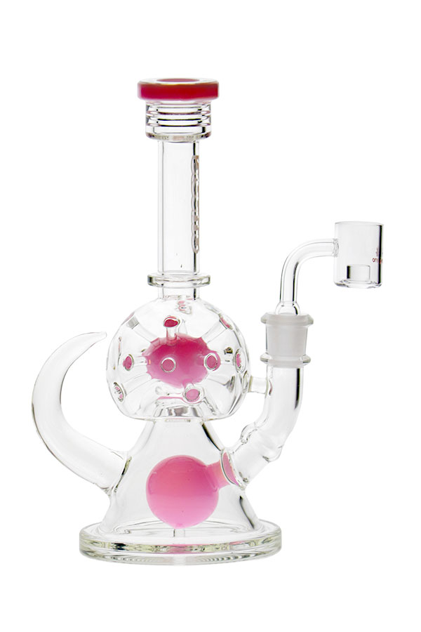 15-Arm inner space ball with ball percolator: The smoke exits the ball percolator before having to move around the arms of the spaceball for a second pass in cooling before exiting the mouthpiece.