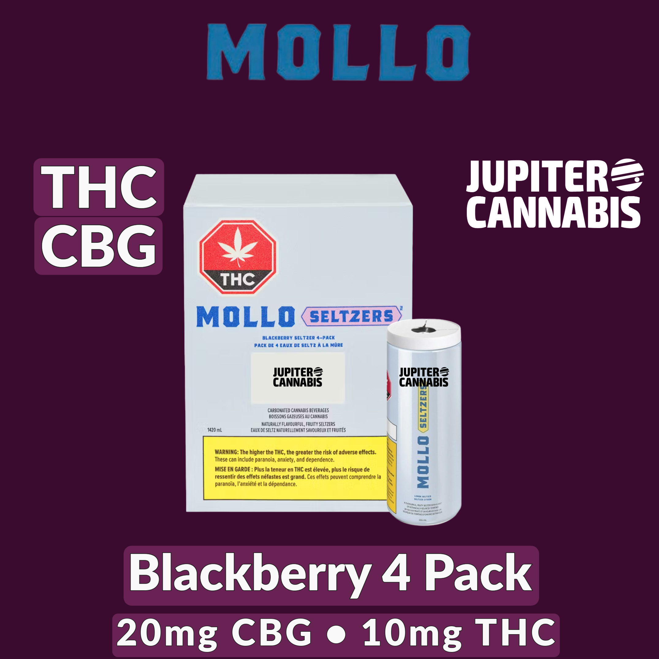 Sip back with Mollo Blackberry Seltzer. Taste the familiar effervescence and natural bold blackberry flavours infused with nano-emulsified 10 mg of THC and 20 mg of CBG. No Sugar!