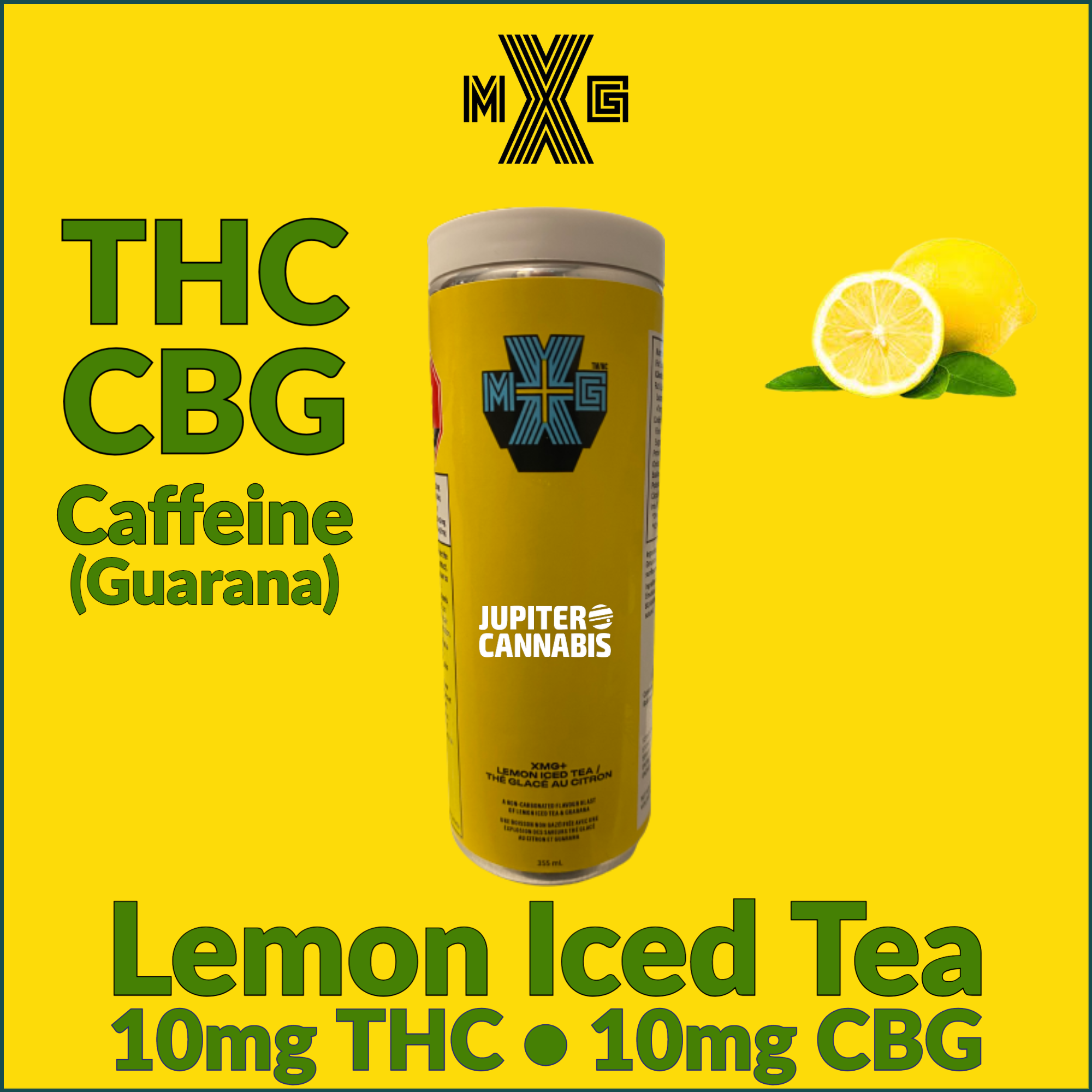 XMG+ Lemon Iced Tea CBG+Caffeine has 10mg THC, 10mg CBG and Guarana in a naturally caffeinated beverage with a non-carbonated flavour blast of lemon iced tea.