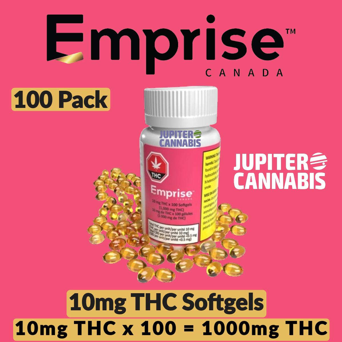 Emprise’s 10mg THC Softgels in the maximum potency available in Canada 1000mg THC per bottle. Each Softgel delivers 10 mg THC in a discrete dosage form. These softgels are manufactured with concentrated THC distillate and Virgin Hemp seed oil – After all if it grows together, it goes together.