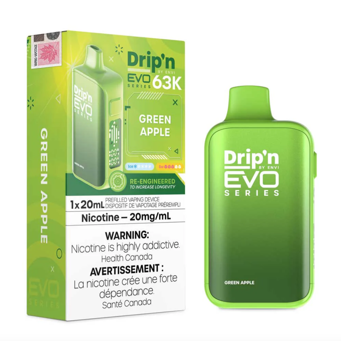 The Green Apple Dripn Evo 63K delivers crisp, tart green apple with a light icy finish that sharpens the fruit notes.