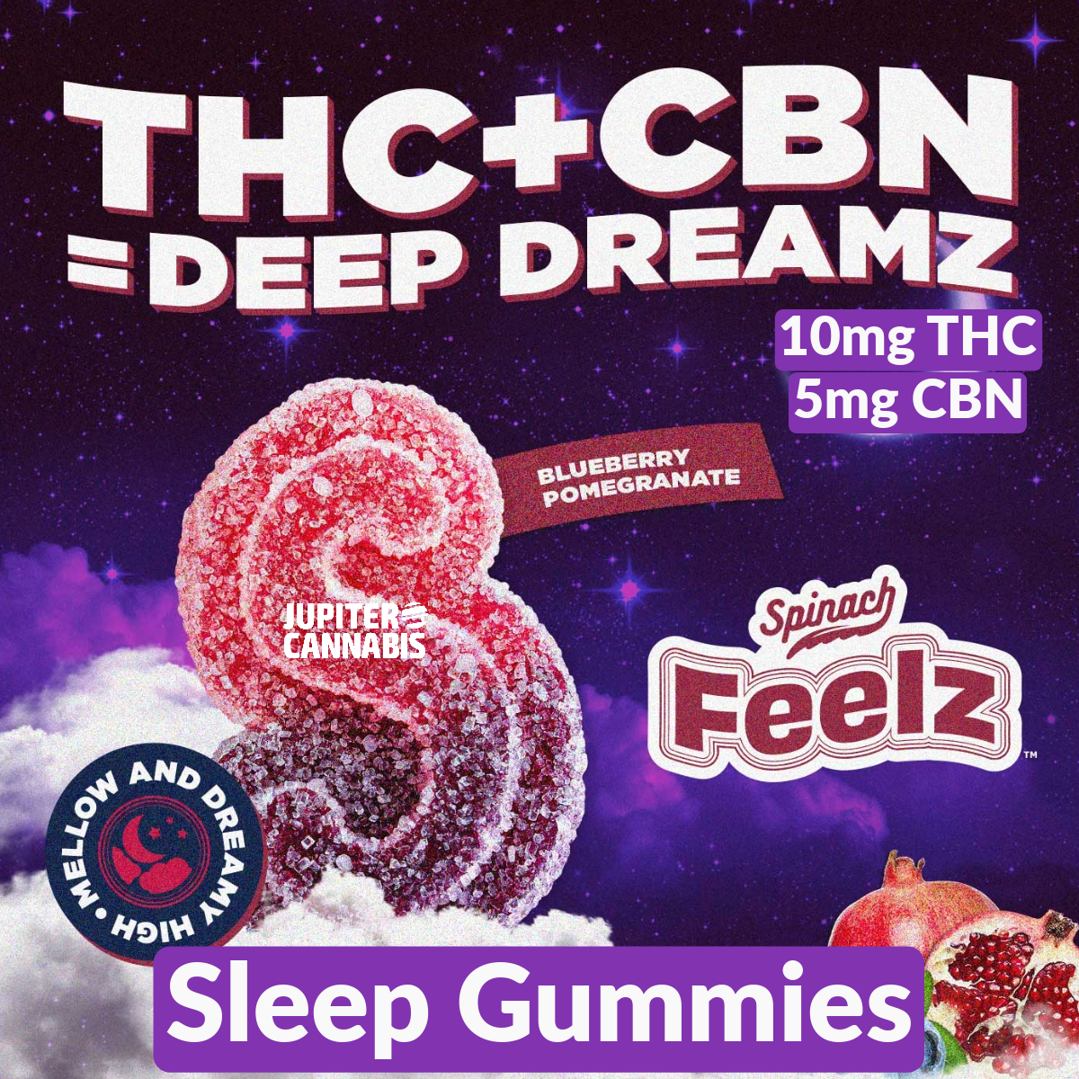 Relax and drift away with Spinach FEELZ™ Deep Dreamz THC+CBN Sleep gummies. These delicious blueberry pomegranate gummies are ideal for a mellow and dreamy high, thanks to our special blend of THC and rare cannabinoid, CBN. Perfect for consumption right before you say goodnight. Two sour-then-sweet gummies, with 10mg of THC and 5mg CBN Totals per pack. Feelz. The Way You Want. Two gummies and there is 10mg of THC and 5mg of CBN per package.
