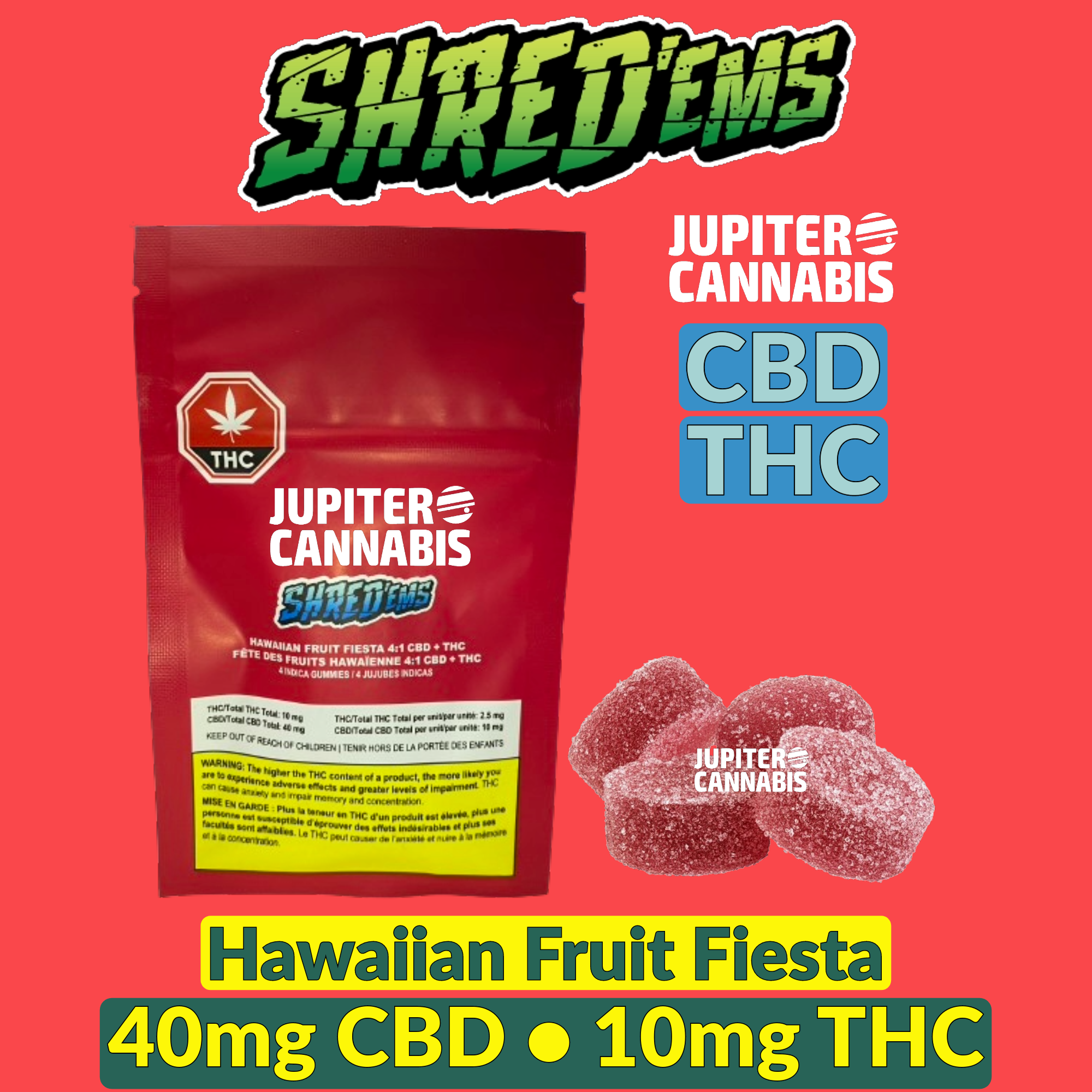 Add some CBD to your next session with Hawaiian Fruit Fiesta SHRED’ems, a delicious indica leaning soft chew containing 40 mg of CBD and 10 mg of THC per pack.