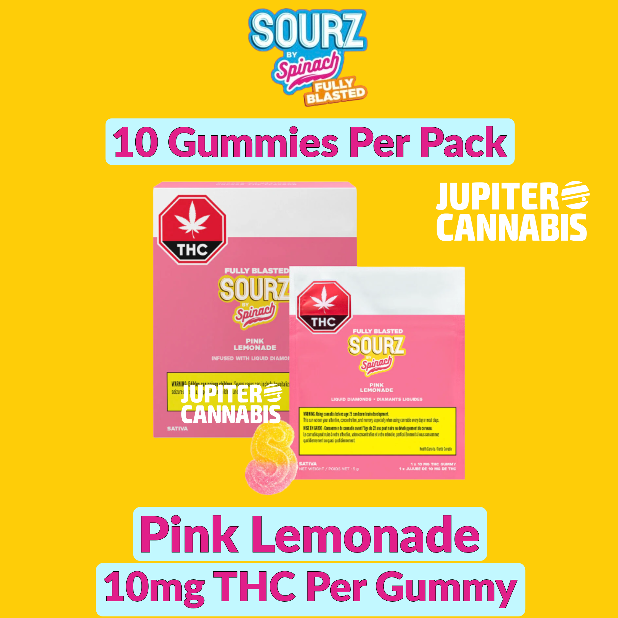 Prepare for blast off! SOURZ by Spinach® Fully Blasted Pink Lemonade gummies are packed with 10mg THC per piece. Send your taste buds into the stratosphere with the sweet and fresh flavours of raspberry and lemonade! These dual-flavoured gummies are over-the-top with natural flavours and blasted with sour crystals. Enjoy 10 gummies with 10mg THC per gummy and 100mg THC per pack.