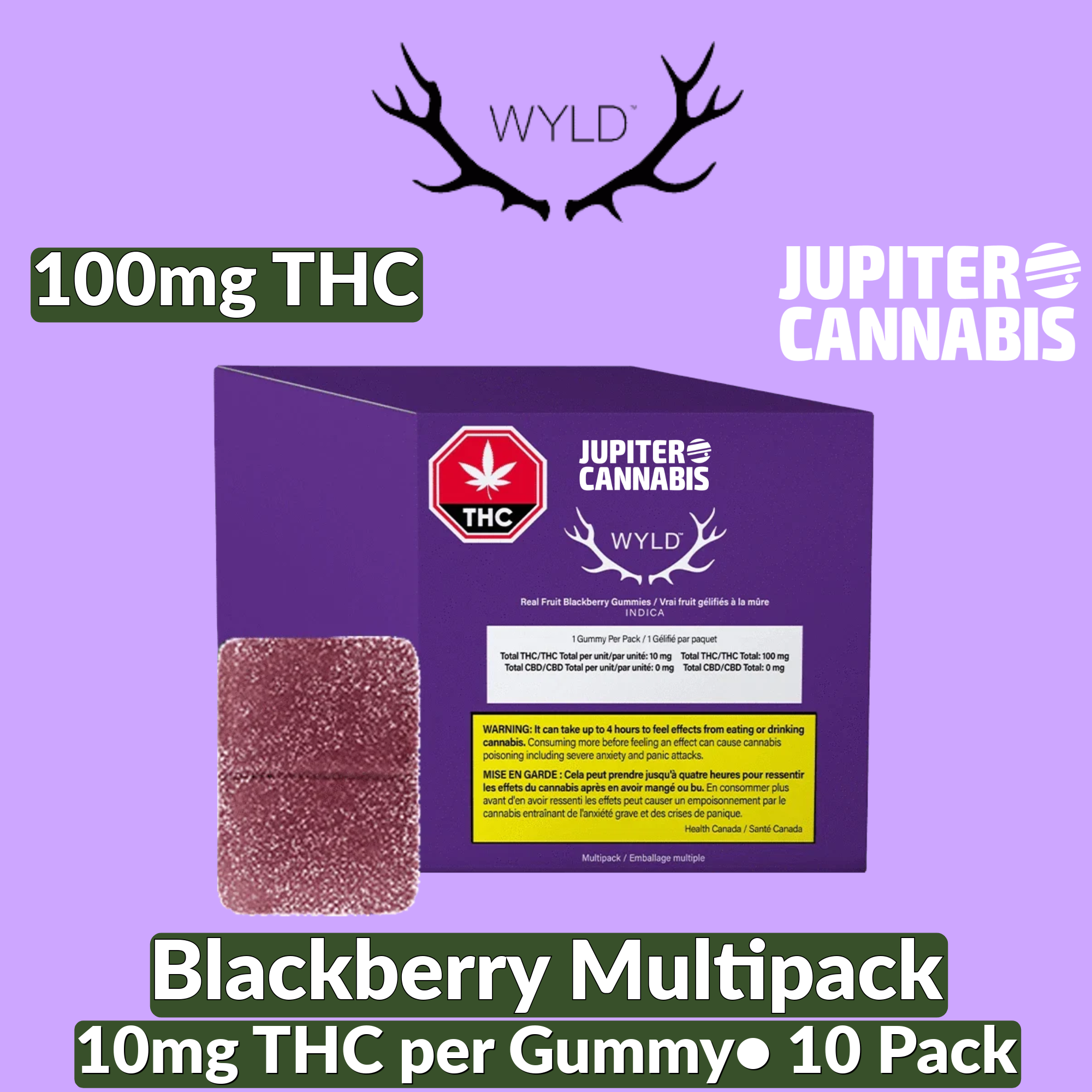 This multipack contains 10 immediate containers, each with one soft chew-for a total of 10 soft chews. Wyld Blackberry Indica Enhanced THC gummies are sustainably made using real fruit, botanical terpenes and natural flavours. Each gummy contains 10mg THC, for a total of 100mg THC per pack. All Wyld gummies are packaged in a fully compostable pouch, and our recipes are formulated by food scientists to provide consistent experiences that taste amazing. Wyld gummies use sunflower lecithin to improve bioavailability and onset time and are made to be thermostable up to 55 degrees celsius, with a firm texture that doesn’t stick to your teeth. Each Wyld Blackberry Indica Enhanced gummy contains 10mg of THC combined with the terpenes myrcene, linalool, beta-caryophyllene, and terpineol for a relaxed and euphoric experience.