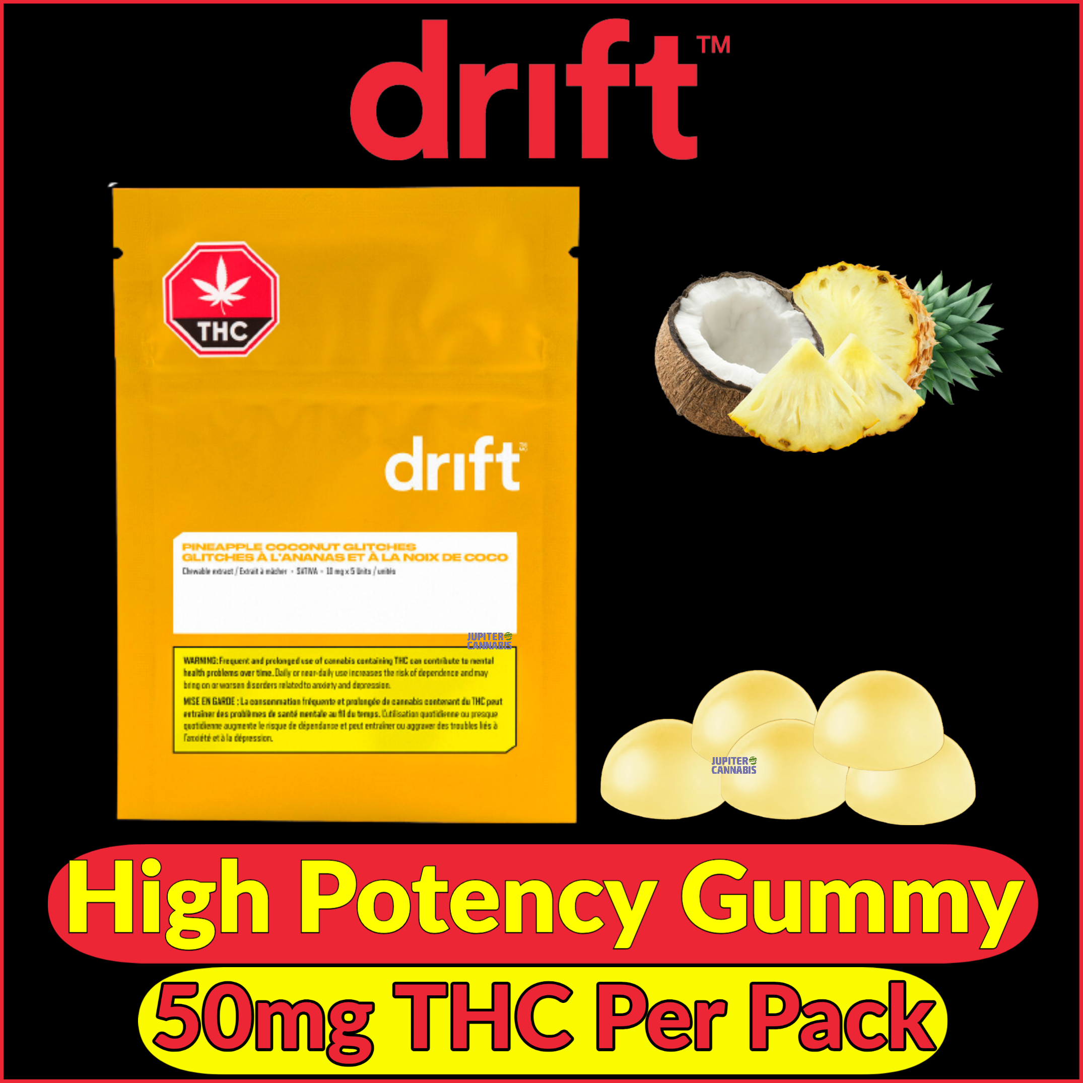 Pineapple Coconut Glitches – a 5-pack of flavoured, chewable extracts from our sister brand, Drift. Experience the sensations of natural tasting pineapple and coconut flavours! Each piece is packed with 10 mg of THC, for a total of 50 mg THC per package.