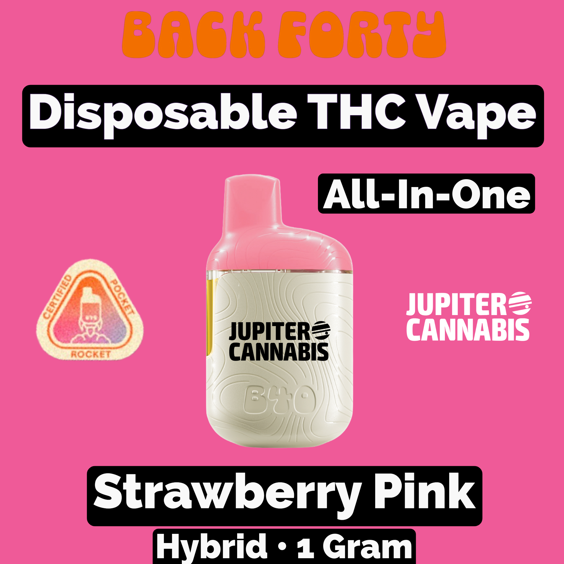 The Back Forty Strawberry Pink AIO 0.95g is an all-in-one, rechargeable, disposable vape pen featuring a hybrid cannabis distillate with a sweet, tangy strawberry and pink lemonade flavor profile.
