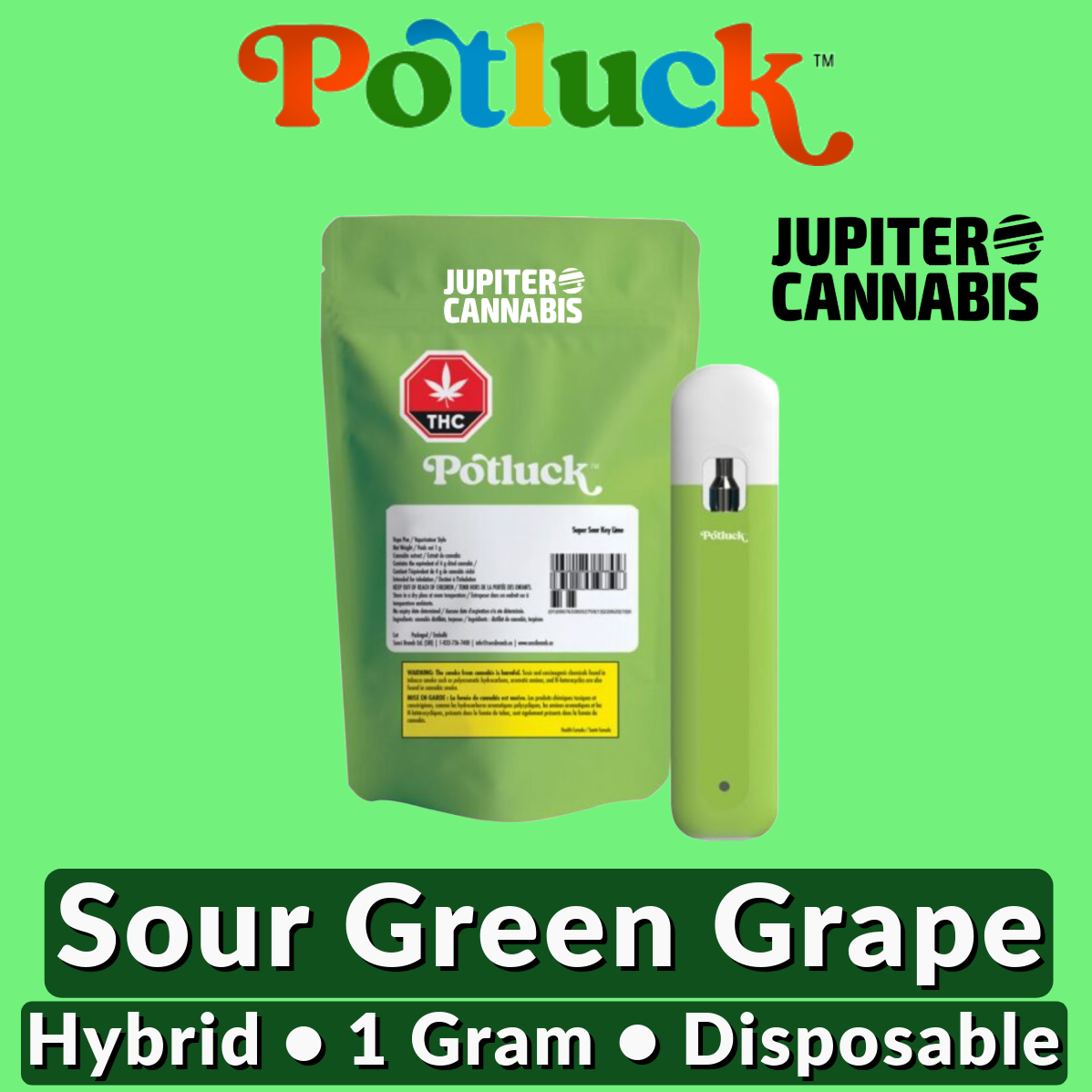 Our Sour Green Grape 1g disposable vape has a sour bite of flavours, mixing ripe green grapes and undertones of sweetness. Add a zesty and fresh experience for your tastebuds with a sweet and tangy aroma. Potluck’s all-in-one disposable vape is powered by CCell, providing a reliable, flavourful, and portable product.