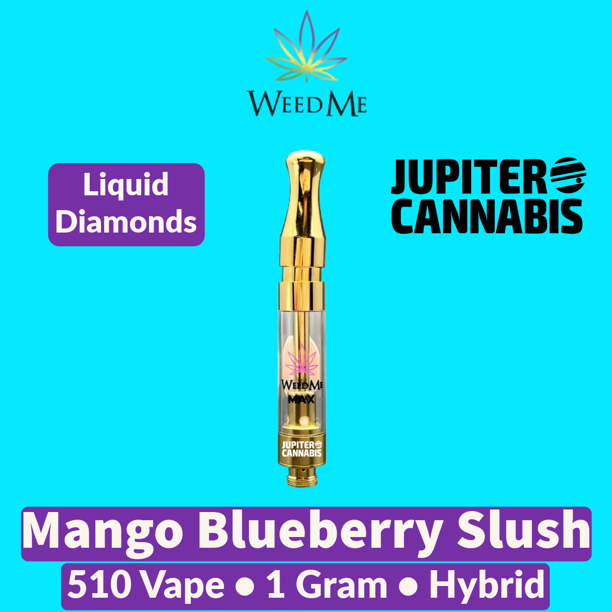 Liquid Diamond Mango Blueberry Slush is a hybrid 510 thread standard vape cartridge. This high potency liquid diamond vape offering from Weed Me Max brings a fruity mango flavour, followed by a lip smacking wave of blueberry.