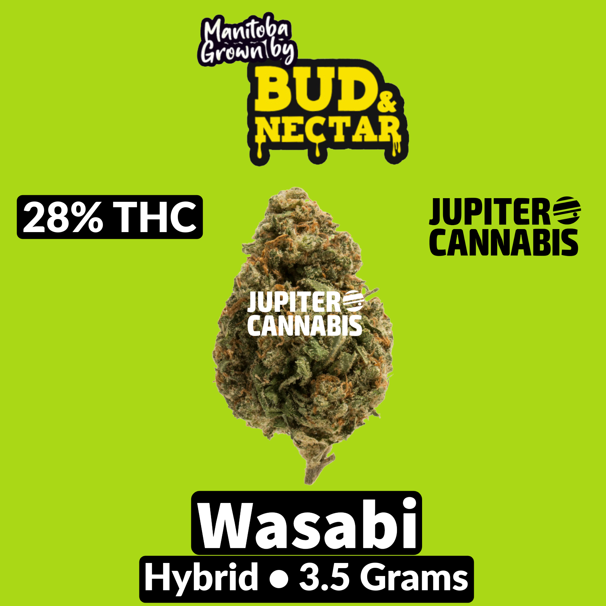 The Bud & Nectar Wasabi 3.5g is a hybrid dried cannabis flower product known for its fruity and sweet smell with a creamy finish, available at various dispensaries in Manitoba, Canada.