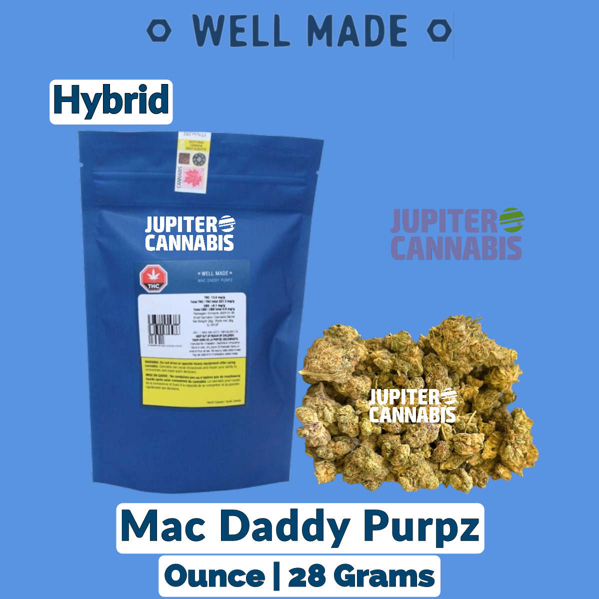 Mac Daddy Purpz is a Hybrid strain that leans to the Indica side of the spectrum. Well-structured buds that feature punches of purple across a bed of frosty trichomes are accented by thick orange hairs make this flower visually stunning. Mac Daddy Purpz is packed with grape soda and buttery sugar flavours and features a stunning citrus aroma. Known for its relaxing, non-sedative effects, this strain is sure to be a consumer favourite. WELL MADE zips always look to hit the right quality of flower, potency and price for the large format consumer.