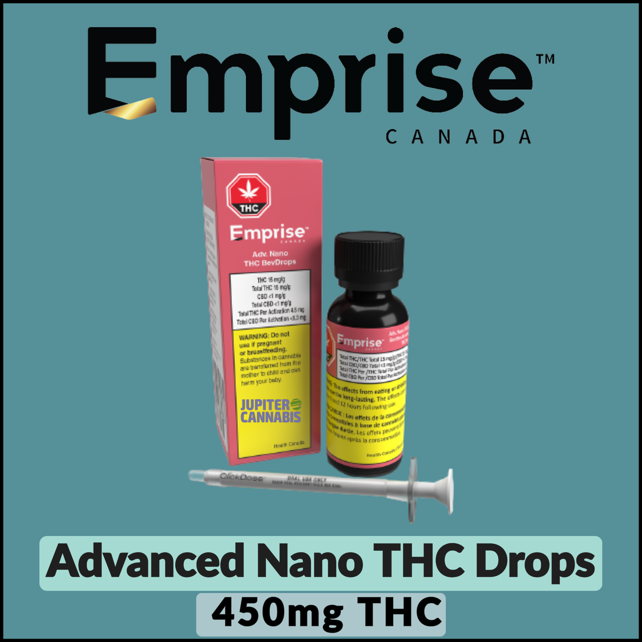 Each bottle contains 30 g of emulsion (450 mg THC). A syringe with 0.3 ml capacity is also included. One syringe dose delivers 4.5 mg THC. This is the most advanced formulation of Nano on the market.