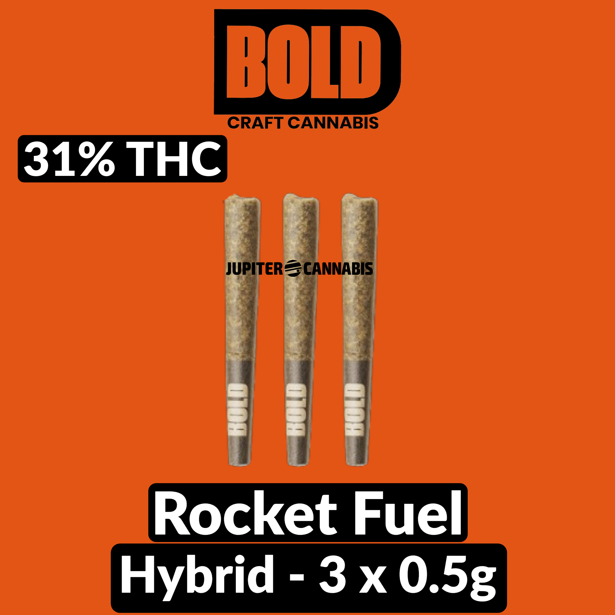 BOLD Rocket Fuel is a high-potency, indica-dominant hybrid pre-roll (3×0.5g) known for its heavy, gassy, and earthy diesel aroma. Crafted from a cross of Jet Fuel OG and Face Off OG, this strain is indoor-grown, hang-dried, and hand-trimmed to provide a strong, relaxing body high.