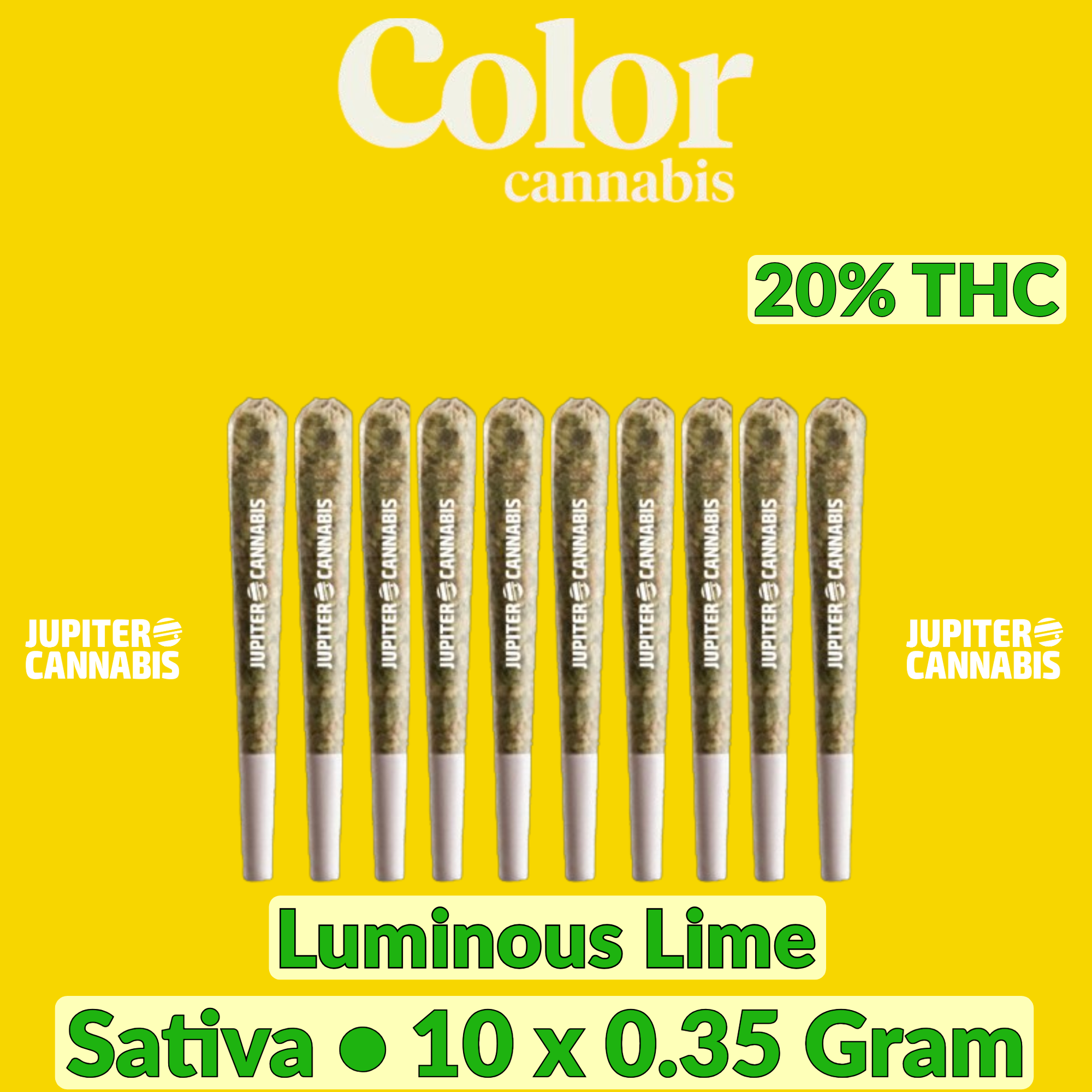 Color’s Luminous Lime 10×0.35g pre rolled joints are a sativa-dominant hybrid legacy phenotype of White Widow, a genetic cross of a Brazilian Sativa and Indian Indica. It’s dominant terpenes – Beta-Caryophyllene, Alpha-Bisabolol, Nerolidol, Guaiol and Linalool produce a sour citrus and funky flavour and aroma, with hints of pine. These pre-rolls are perfectly packed with gently milled flower, not trim or shake, to ensure each joint contains the freshest and most flavourful cannabis possible. Perfect for stocking up or sharing!