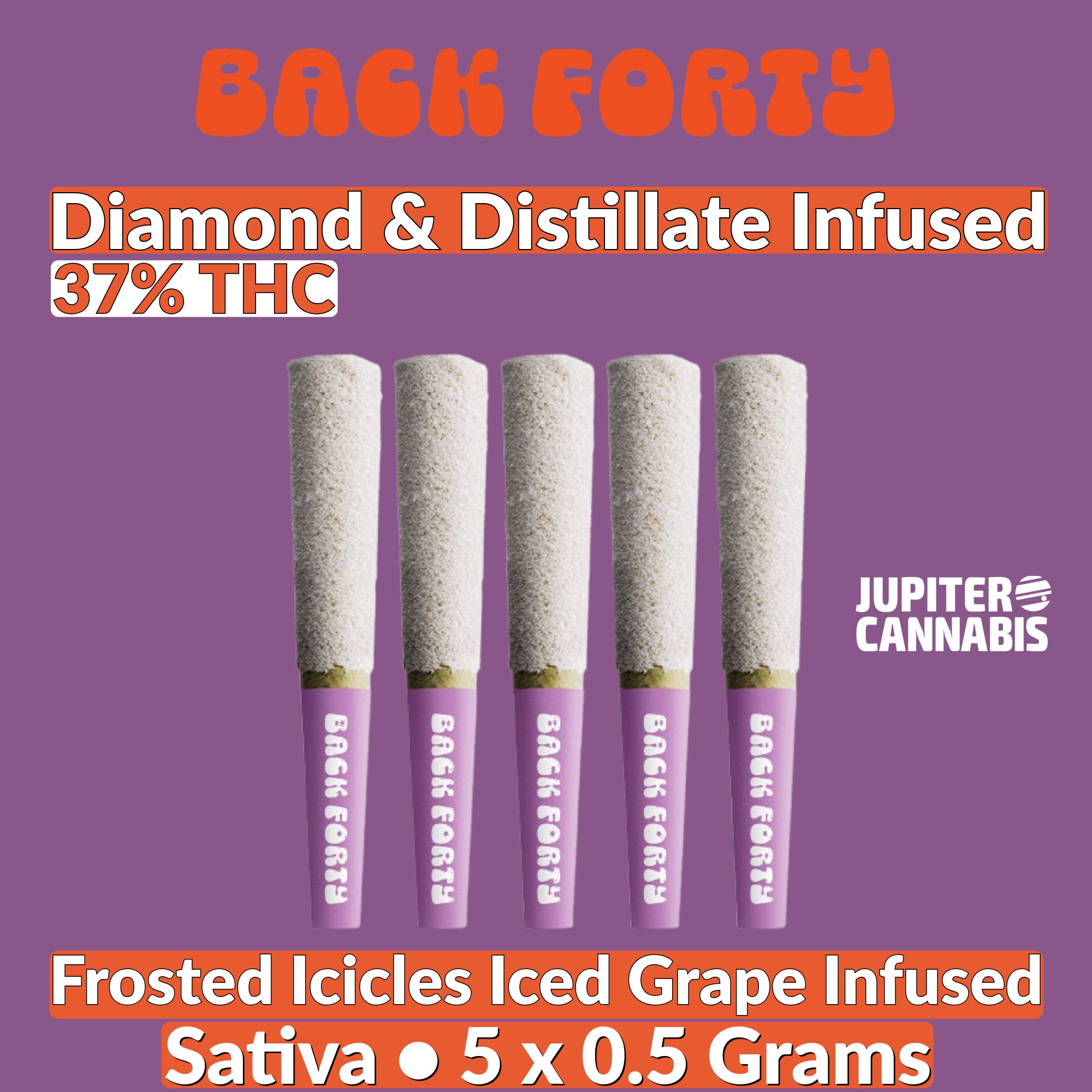 Back Forty Frosted Icicles Iced Grape Diamond & Distilate infused pre-roll, 5×0.5g (2.5g total). 37.0% THC.