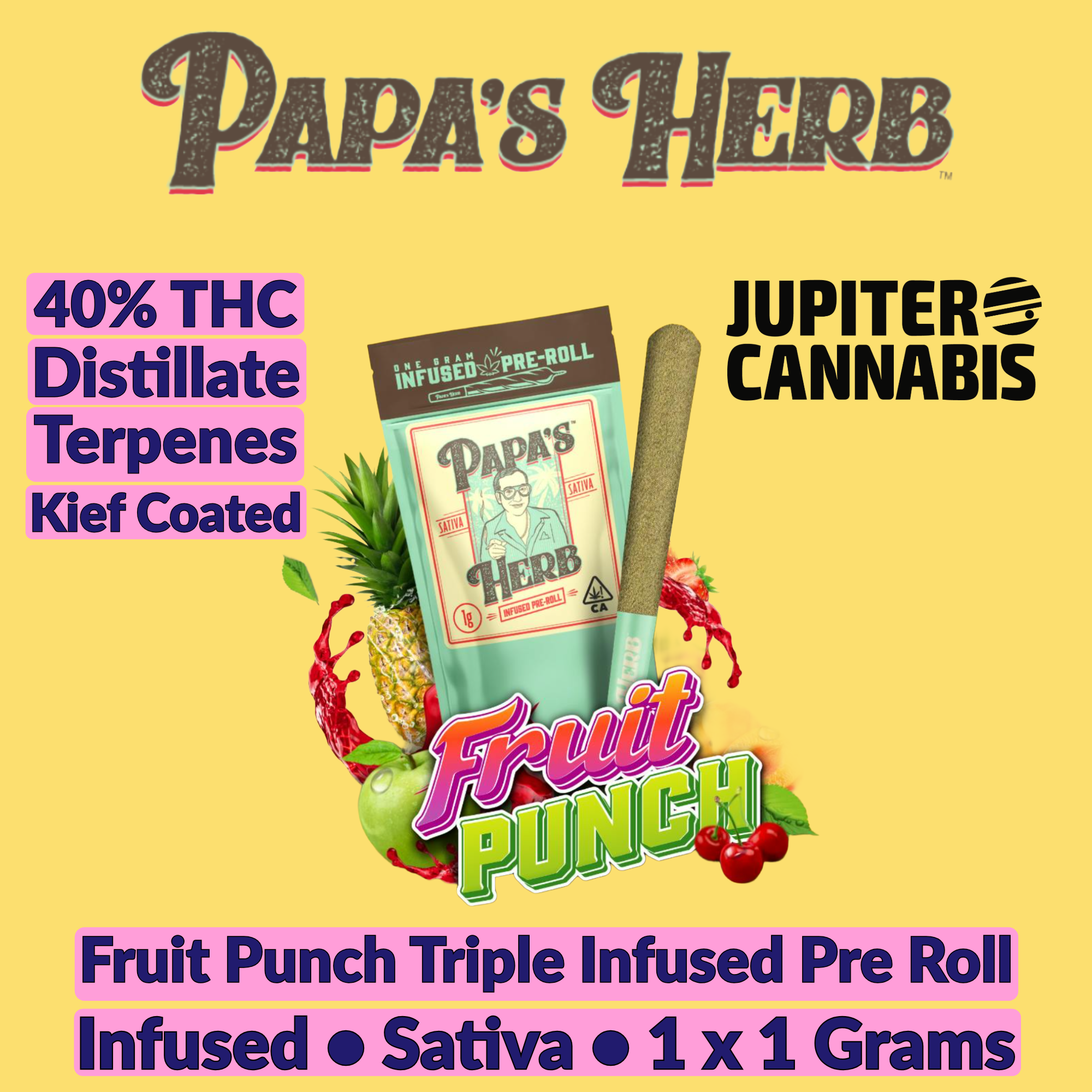 Papa’s Herb Fruit Punch Triple-Infused Pre-Roll, bursting with tropical flavours! This masterpiece is infused with a proprietary blend of terpenes and high-potency distillate, then rolled in kief. Come to Papa!