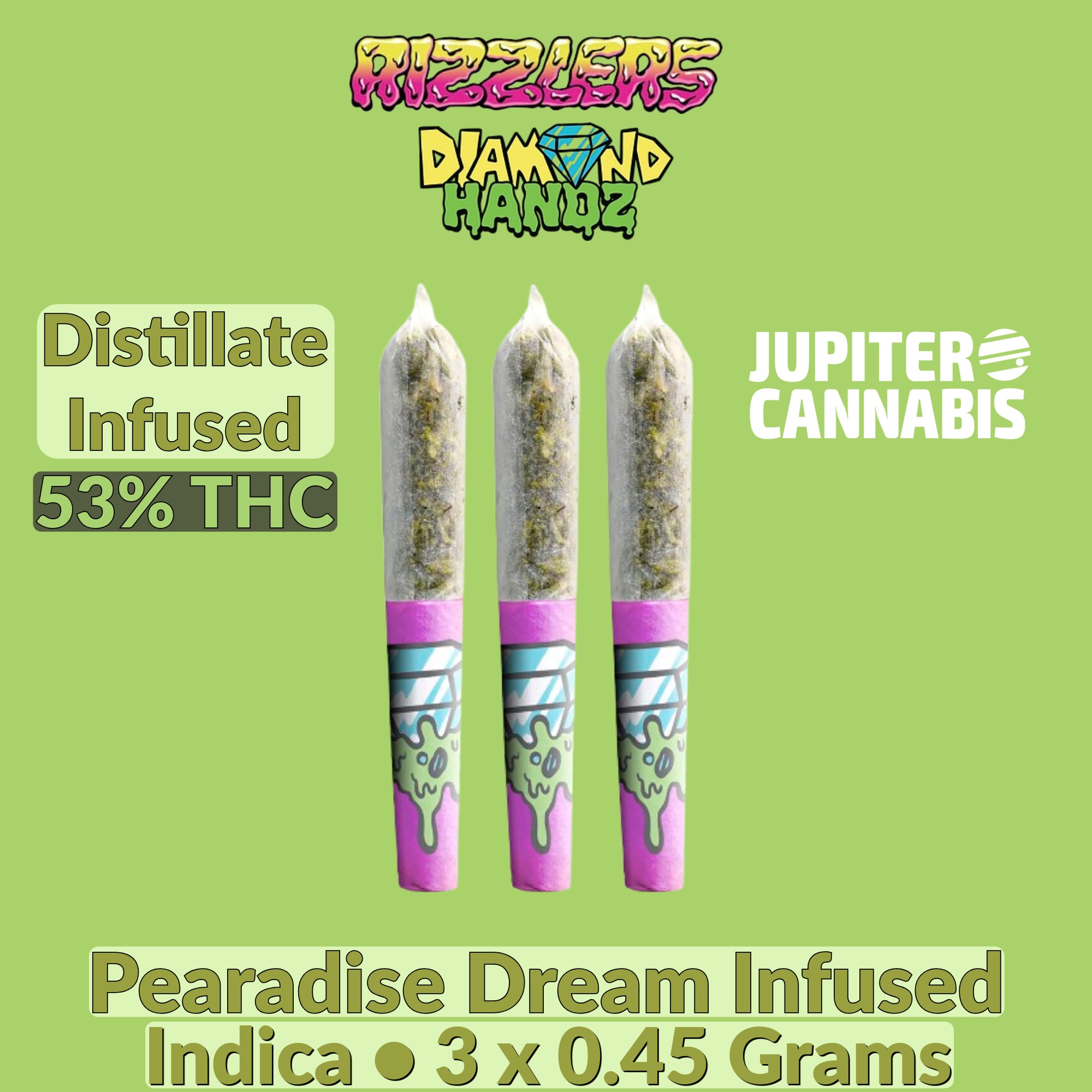 Rizzlers Pearadise Dream is a premium infused pre-roll enhanced with cannabis concentrate for elevated potency. This indica product contains 3-pack of 0.45g at 53% THC, delivering powerful relaxing and calming effects. Infused cannabis products offer a stronger experience than traditional flower. Available at Jupiter Cannabis in Winnipeg, Manitoba.