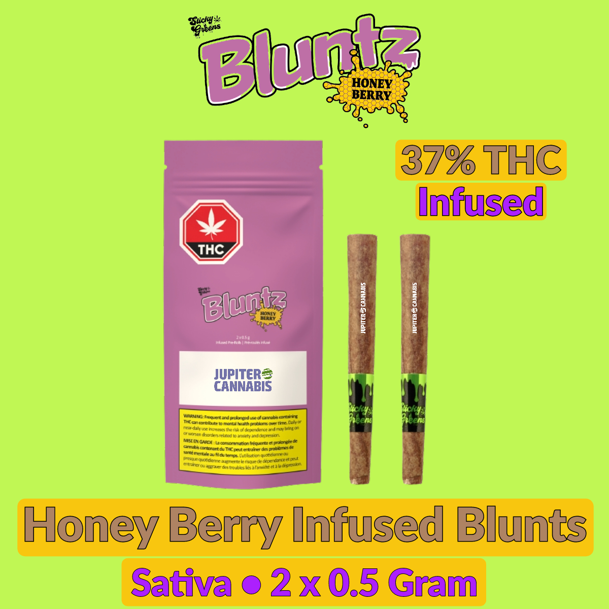 Sticky Greens Bluntz combine an old fashioned blunt experience with deliciously infused flower. We carefully infuse our blunts with a distillate core and naturally derived terpenes that showcase highly sought after blunt flavours. Honey Berry is true to its name and packed with pungent purple berry flavours followed by creamy honey and vanilla notes.