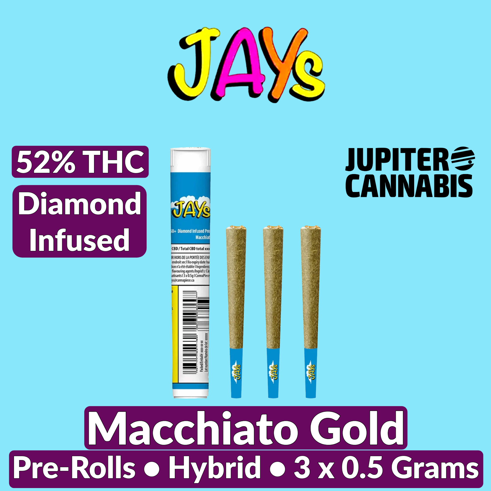 Jays presents playful and potent products full of flavour in convenient formats. The popular Macchiato Gold is now available in diamond infused pre-rolls loaded with flavours of coffee and hazelnut, expertly twisted up for a solid, slow burn.
