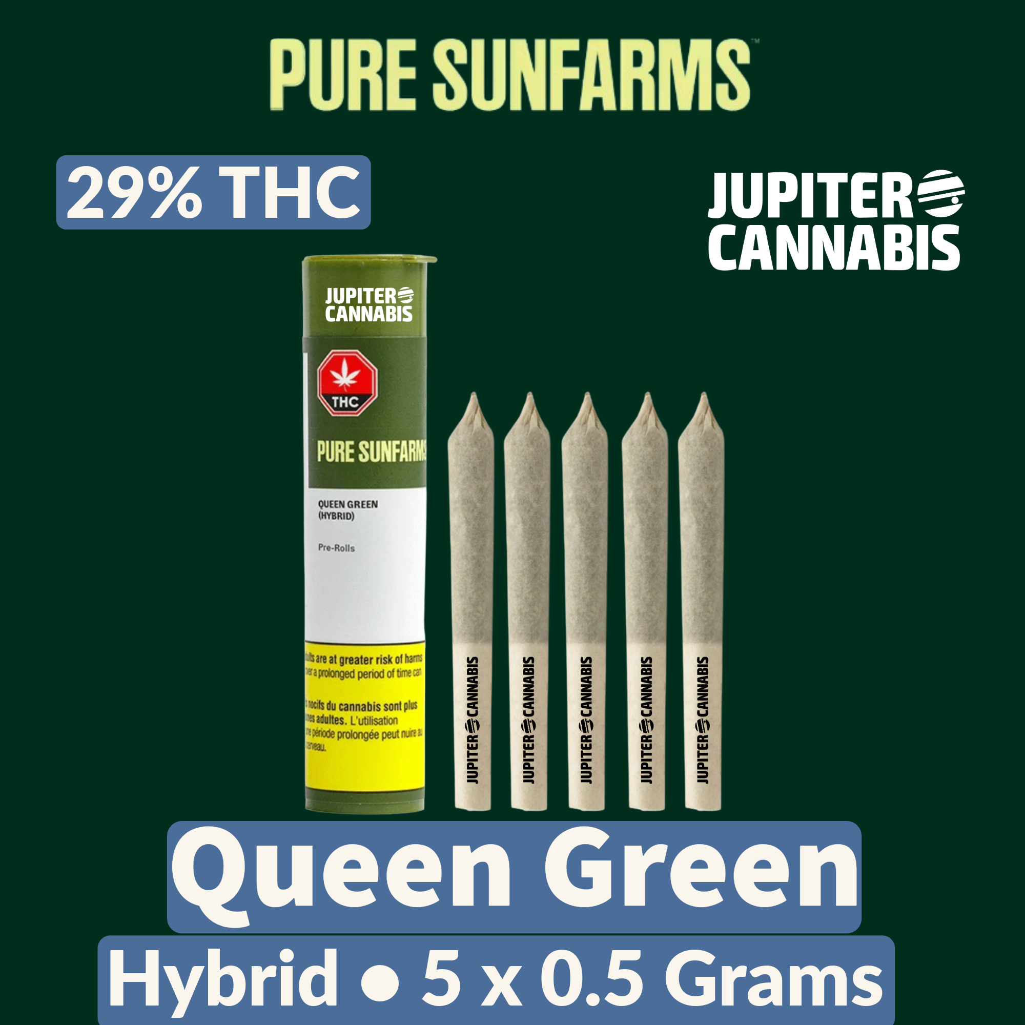 Queen Green is a heavy-hitting herbal hybrid cross of Space Queen x Green Crack. Its fresh and earthy aroma profile delivers notes of herbs, dairy, and toasted peppercorns, complimented by a touch of citrus and pine, from dominant terpenes caryophyllene, limonene, linalool. Ready to burn in a pack of five.