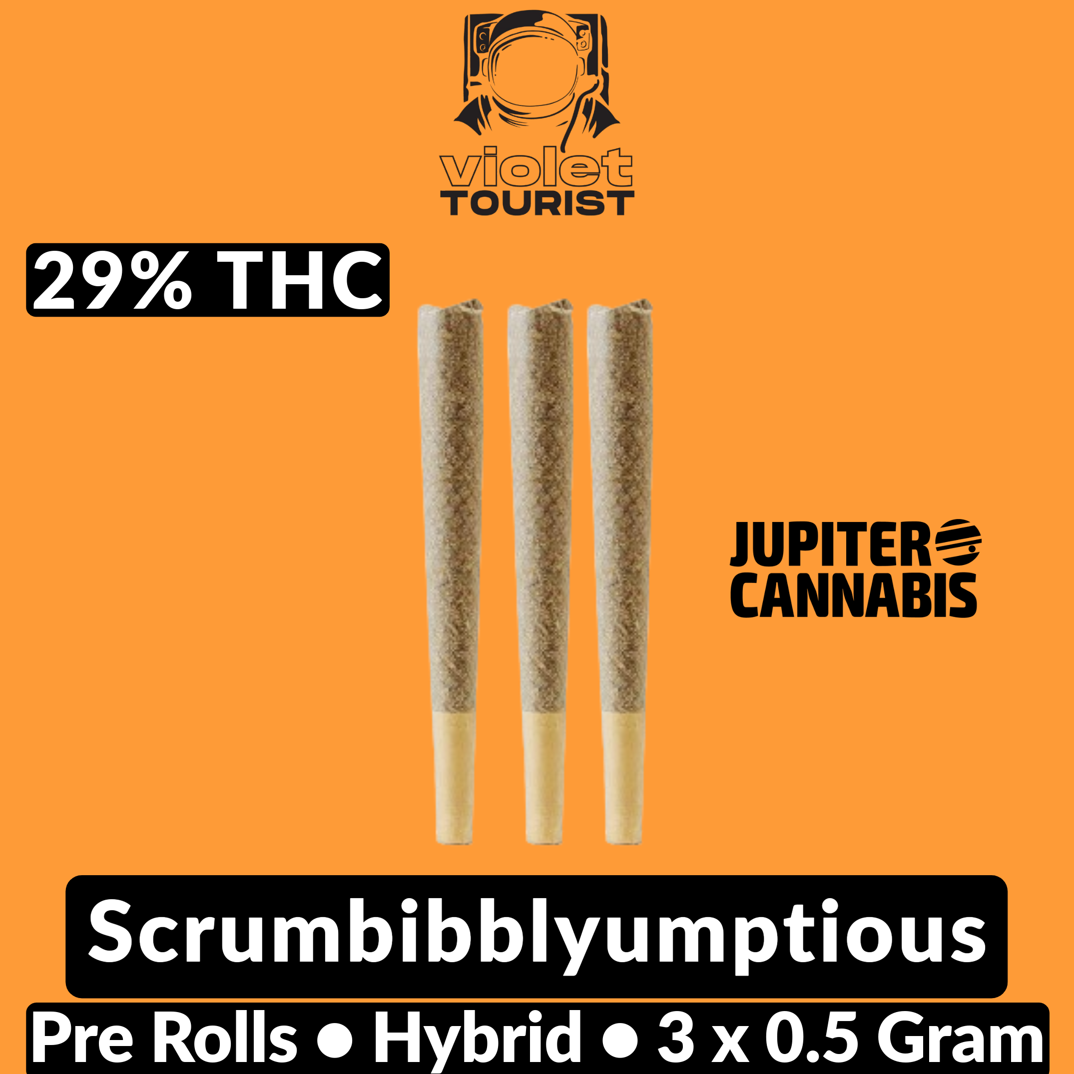 Violet Tourist Scrumbibblyumptious Rotational is a hybrid pre-roll pack containing 3-pack of 0.5g. Each pre-roll is crafted for balanced effects with 31.0% THC potency. Convenient and ready to enjoy. Available at Jupiter Cannabis in Winnipeg, Manitoba.