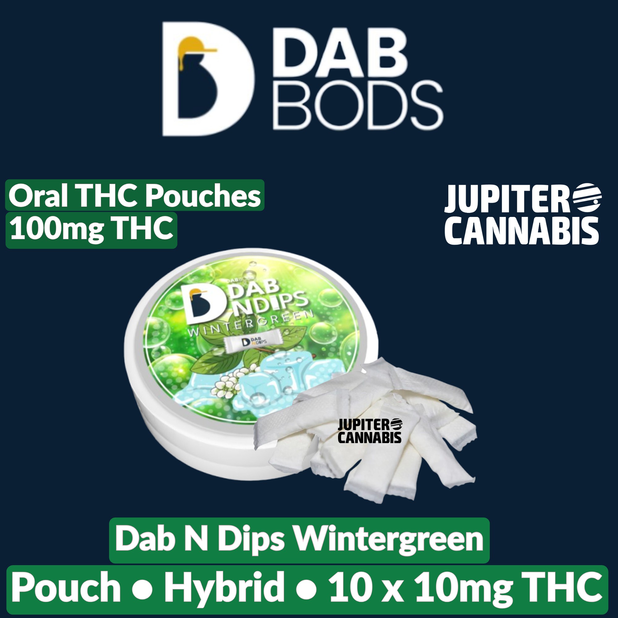 Just out for a dip are ya bud? Dab Bods presents to you, one of the most discreet, convenient and tastiest way to consume THC with our Dab Bods Dab n Dips! Walk through the Wintergreen forest and take these little dips for a spin at a price point that won’t leave a hole in your pocket, just a ring. Each container contains 10 x 10mg pouches.